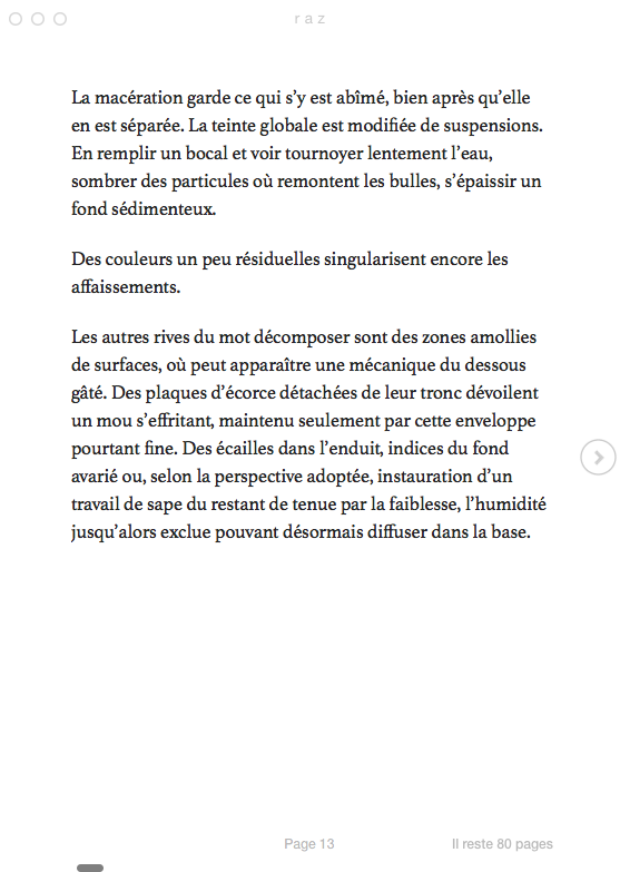 Suivre au plus près les mutations d’un décor-monde à dominante organique, porter attention aux nuances de changements d’états et de formes des matériaux, des matières… voilà où — de flashs d’images en flashs d’images — ce texte nous entraine dans une expérience de visualisation et de perception du monde qui nous entoure — l’infiniment petit y compris.
